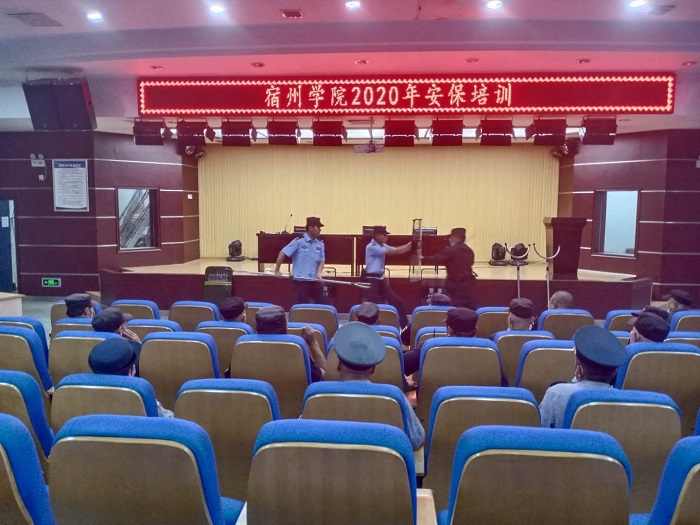培训会上,宿州市公安局国保支队卢远芳同志讲解了反恐知识和校园突发事件处置办法,并带领安保队员对安保装备器械进行了演练。保卫处综治科长王敦勇结合疫情防控要求,要求安保队员工作中要做到一丝不苟、慎之又慎,严格履行岗位职责,才能确保校园安全稳定,为2020届毕业生顺利返校创造一个安全的校园环境。