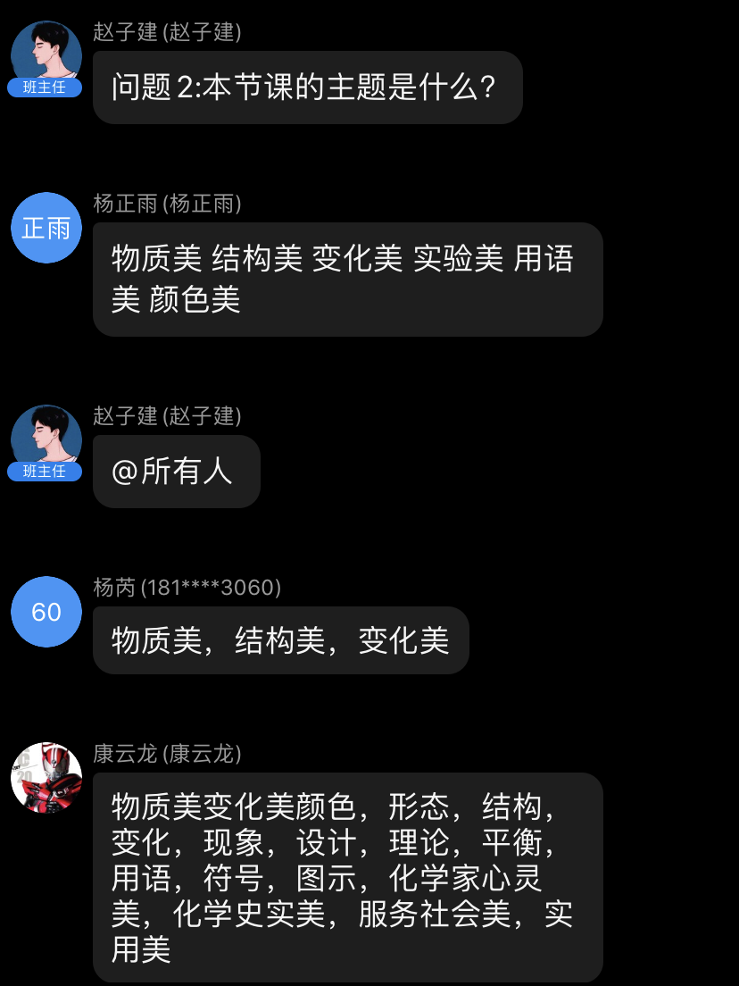 徐基贵首先从化学之美在于化学物质美、化学之美在于化学结构美、化学之美在于化学变化美、化学之美在于化学实验美、化学之美在于化学理论美、化学之美在于化学家的心灵美、化学之美在于化学史实美、化学之美在于服务社会美、化学之美在于其自我修正美,这九个方面向同学们介绍了本次讲座的主要内容,并提出探究“化学无处不含美,但美在何处?”这个问题的重要性。之后,从这九个部分展开了深入的、全面的讲解,并一一举出实例和播放实验视频充分论证了化学无处不含美,理解与感受化学之美有助于同学们对化学更好的理解与探索。讲座最后,徐基贵向同学们提出了两个问题:化学之美有哪些美?本节课的主题是什么?同学们就这两个问题做了认真的讨论与回答,在本次美育大讲堂中获益良多。
