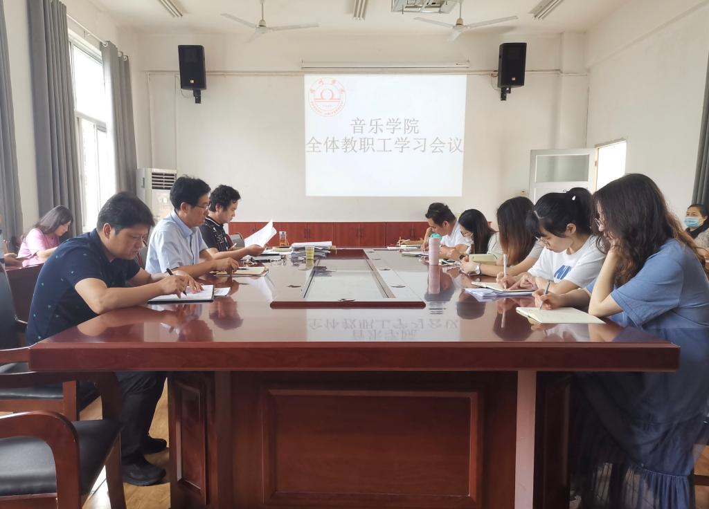 7月14日,音乐学院在艺术楼一楼会议室召开全体教职工学习会议,音乐学院全体教职工党员参加会议,本次会议由党总支书记陈述立主持。