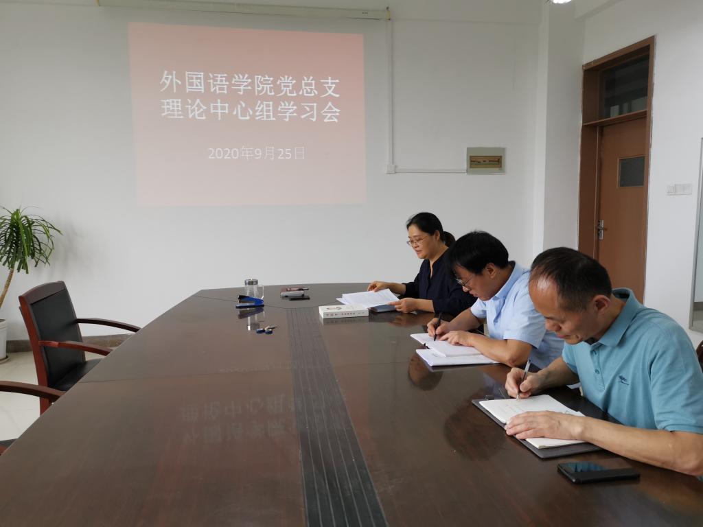 9月25日下午,外国语学院党总支理论中心组在逸夫楼A318召开学习会。党总支书记王华、院长李加强、党总支副书记、副院长郝景东参加会议,会议由党总支书记王华主持。