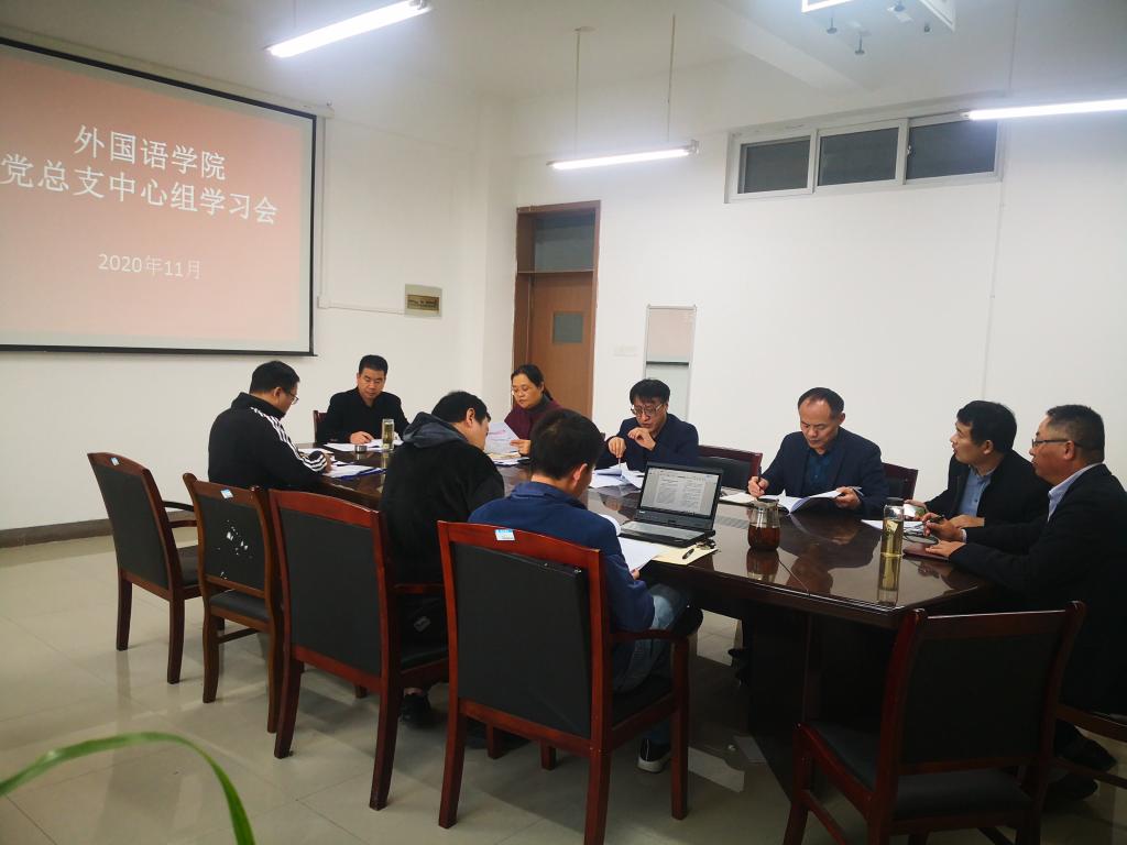 11月9日,外国语学院党总支在逸夫楼A318会议室召开理论中心组学习会,党总支书记王华、院长李加强、副书记、副院长郝景东、总支委员、支部书记参加学习会。会议由党总支书记王华主持。
