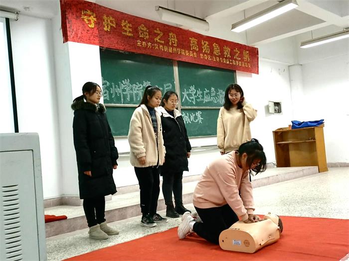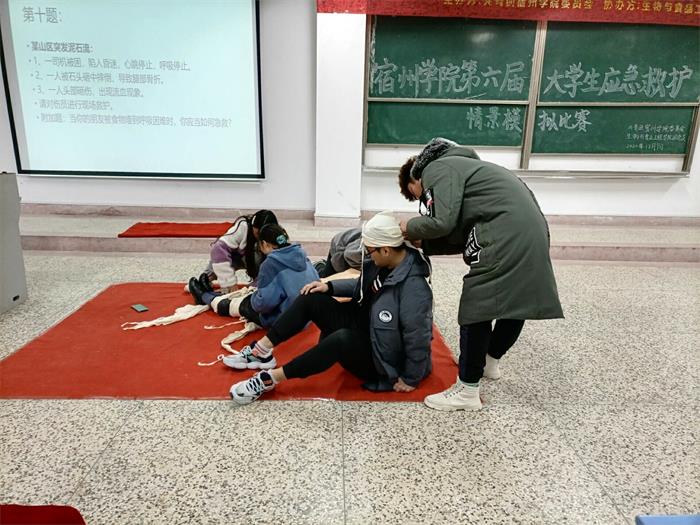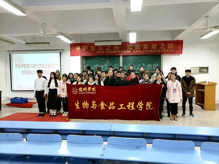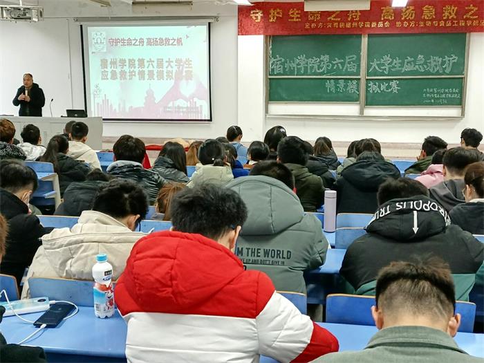为增强同学们对疾病预防的本领,提高学生们面对突发事件和紧急避险逃生自救互救能力。12月9日下午2点,由共青团大赢家体育委员会主办,生物与食品工程学院团总支承办、宿州市红十字精神传播大队协办的大赢家体育第六届大学生应急救护情景模拟比赛于教学楼B301举办。本次比赛邀请到中国著名急救培训专家岳勋老师,矿建总医院急诊科向斌主任,资深志愿者李正平队长。