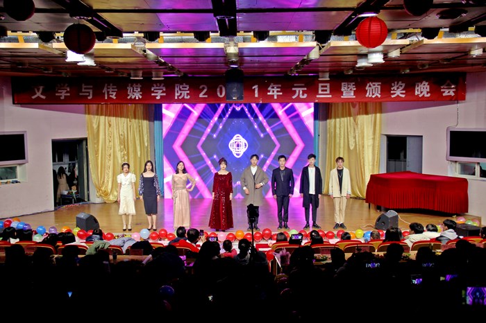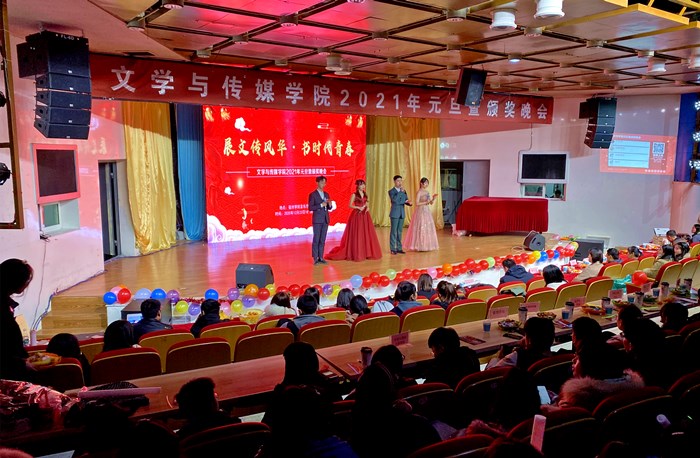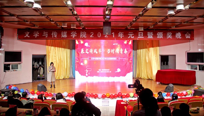 晚会以“展文传风华,书时代青春”为主题,节目流行与古典兼收,温情与火热并举,形式多样,精彩纷呈;涵盖小品相声、舞蹈、对唱合唱、朗诵、模特走秀、乐器合奏等类型节目。晚会现场,台上精彩节目轮番上演,舞台下,观众不断欢呼鼓掌,气氛热烈。对唱《世界上另一个我》以其欢乐的曲调给现场营造了轻松欢快的氛围;小品《招亲大会》《白蛇前传》和相声《众口难调》将观众引领进一个诙谐幽默的世界;中场热舞、港风舞蹈《自作多情》及歌曲串烧,激情洋溢,激起全场观众热烈欢呼;乐器演奏《奇迹》《男儿当自强》使人久久沉醉;模特走秀《绯色》展现出别有的风味;朗诵《青春中国》激情澎湃,充分体现了文传学子青春昂扬、奋发拼搏、憧憬未来的精神风貌;穿插于节目中的抽奖、游戏环节及微信上墙活动为整场晚会增添了不少神秘与惊喜,调动了现场观众的积极性,现场师生纷纷踊跃参加,现场气氛活跃。颁奖在晚会中场举行,为文学与传媒学院2020年“优秀学生干部”“志愿服务先进个人”“先进班集体”等个人和集体颁发荣誉证书。