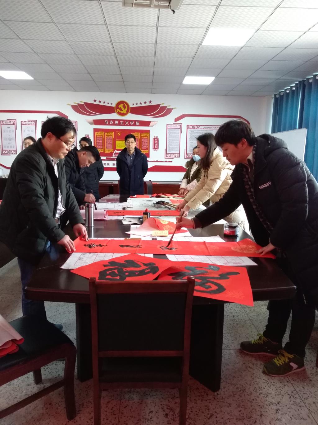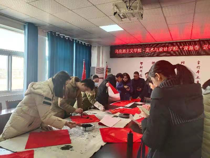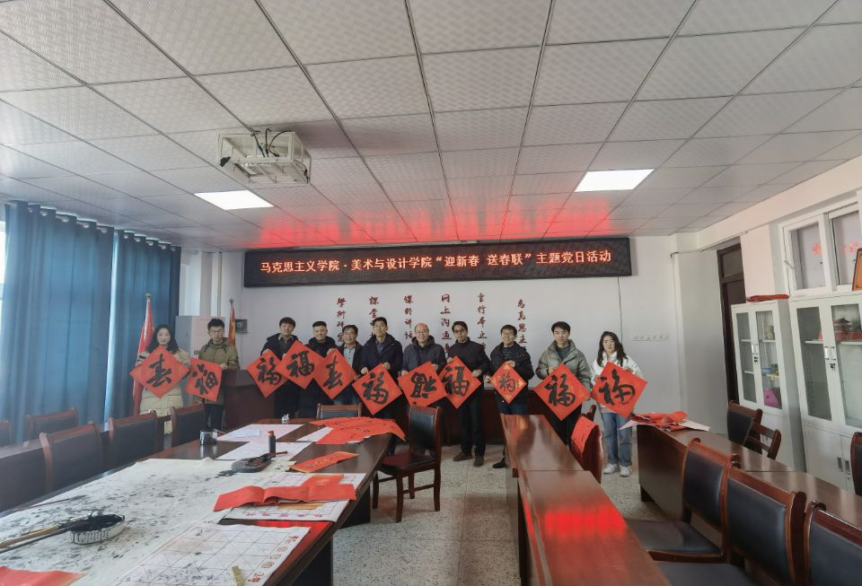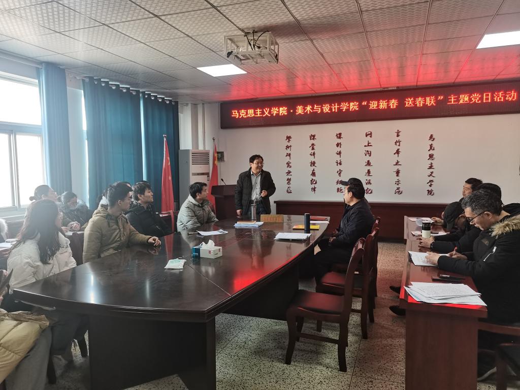 “鼠去牛来辞旧岁,龙飞风舞庆明时”。在新春佳节即将到来之际,为传承和弘扬中华优秀传统文化,进一步坚定文化自信,营造积极向上、欢乐祥和喜庆文明的节日氛围,1月13日上午,马克思主义学院党总支和美术与设计学院党委在马克思主义学院会议室共同开展“迎新春送春联”主题党日活动。马克思主义学院院长李玉才、教师第一、二党支部全体党员和美术与设计学院院长许兴海、组织员边洪强、书法学专业部分老师、学生代表40余人参加活动。活动由马克思主义学院党总支书记赵国付和美术与设计学院党委书记陈述立主持。
