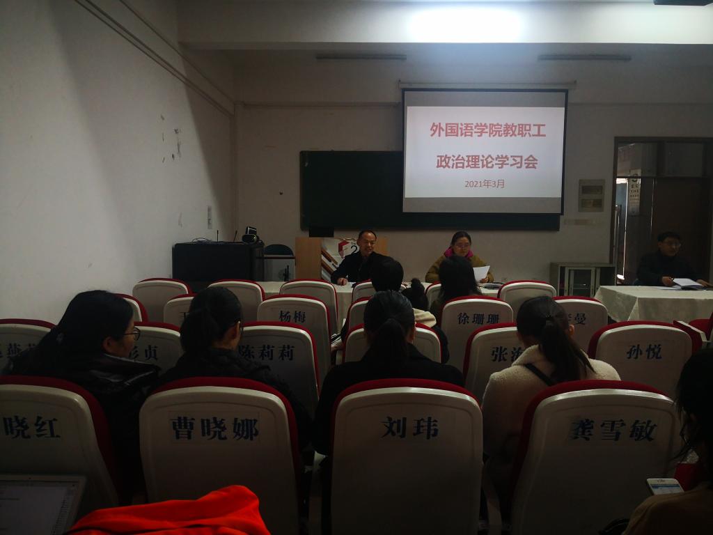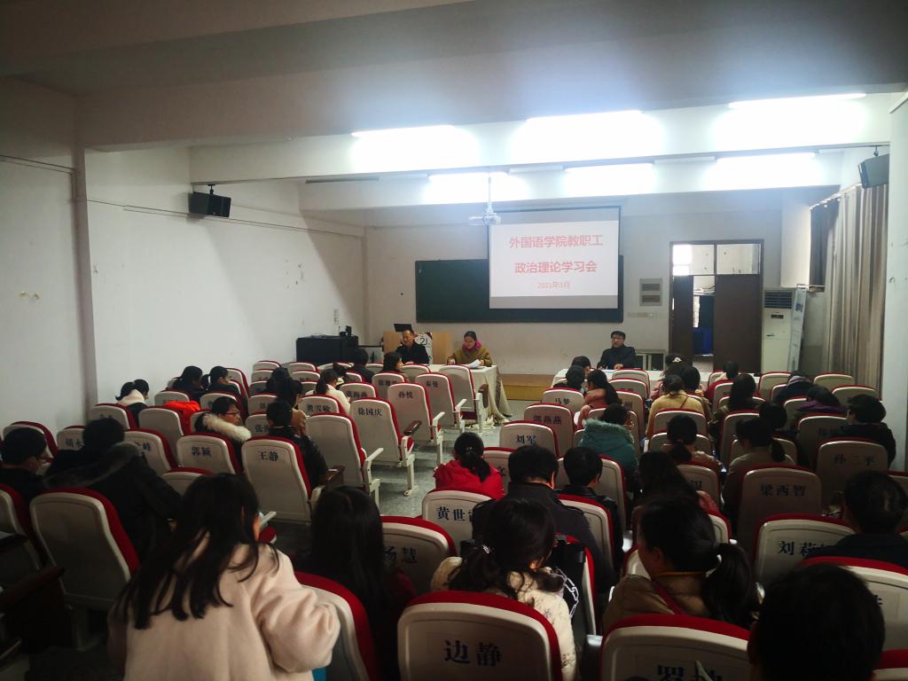 3月5日,外国语学院党委在逸夫楼一楼会议室召开学院全体教职工理论学习会。学院党政领导王华、李加强、郝景东及全体教师参加学习会。会议由党总支副书记郝景东主持。