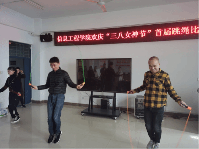 为庆祝“三八”妇女节,丰富教职工文体生活,展示教职工的精神风貌,增强教职工的体育锻炼意识和身体素质,提升教职工向心力和凝聚力,展示教职工积极向上的精神风貌,信息工程学院于2021年3月10日中午举办了“欢庆’三八’节,跳动身心悦”首届跳绳比赛。学院党政领导班子对本次活动给予了大力支持,同事们热情高涨,参与率很高。