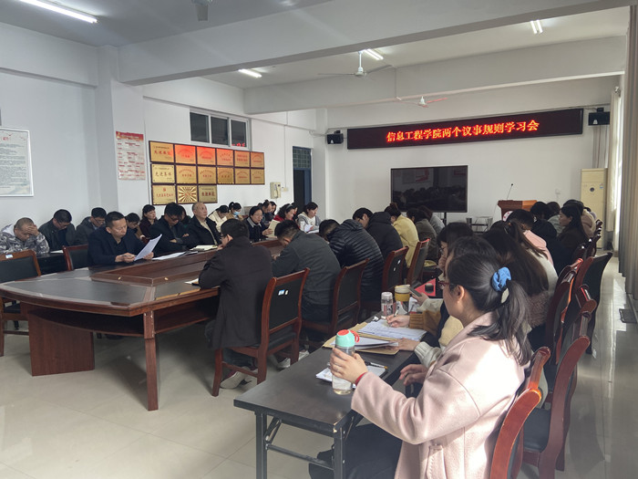 为进一步发挥党组织的政治引领作用,健全完善两个议事决策制度的落实机制,2021年3月24日,信息工程学院在工B315会议室组织全体教职工学习两个“议事规则”。会议由信息工程学院党委书记路红梅主持。