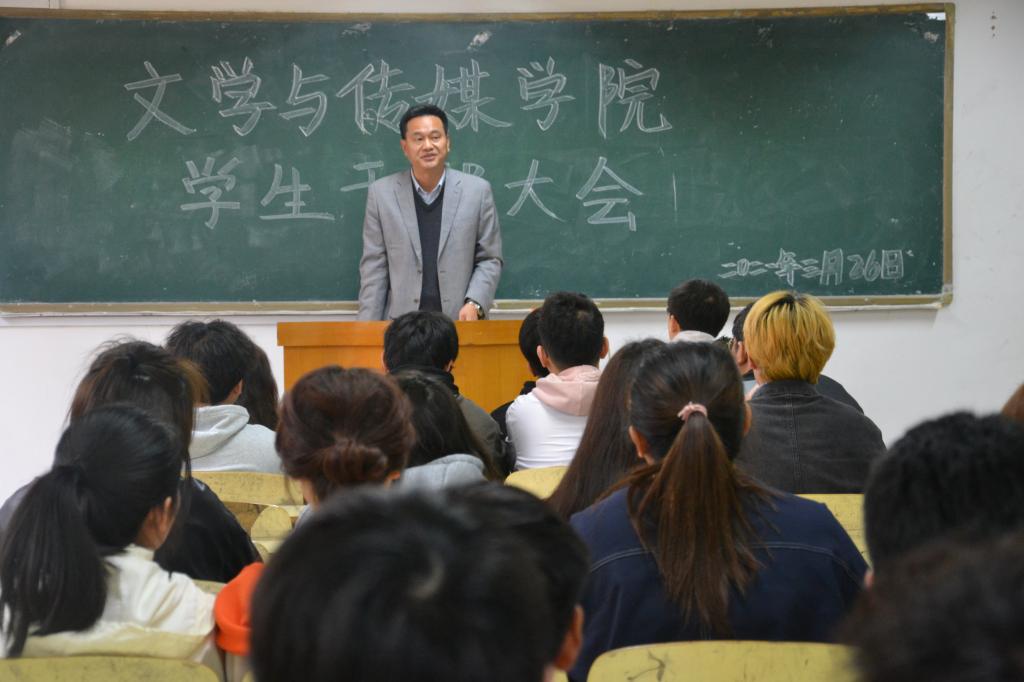 为进一步推动文学与传媒学院的团学工作,提升学生干部的综合素质,充分发挥学生干部的的先锋模范作用,3月26日13时,文学与传媒学院团总支在教学楼A103召开学生干部大会,文学与传媒学院党委副书记王绍卫、团总支书记张浩、辅导员王龙龙、团学各部门负责人以及第十一届学生会全体人员参加,会议由宣传教育中心余馨雨主持。