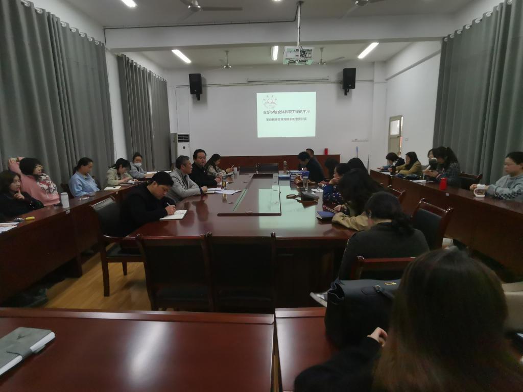 4月21日,音乐学院在艺术楼一楼会议室召开全体教职工理论学习会议,本次会议由党委副书记(临时负责)徐强主持召开。