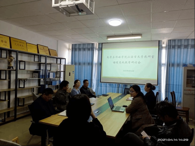 2021年4月14日下午,汉语言文学教研室与新闻学教研室共同举行了课程思政教学研讨会,文传学院李月云书记和张德岁副院长出席了会议。会上,有相关教研项目的老师分别介绍了各自项目的研究现状、待解决的问题和阶段性成果。