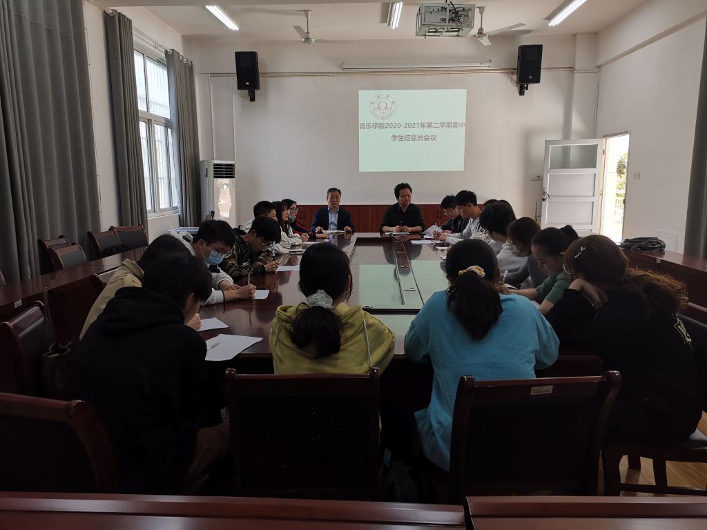 2021年4月29日,音乐学院在艺术楼一楼会议室召开学生信息员会议,院长、党委副书记顾大海,党委副书记(临时负责)徐强以及各班信息员参加此次会议。院长顾大海主持会议。