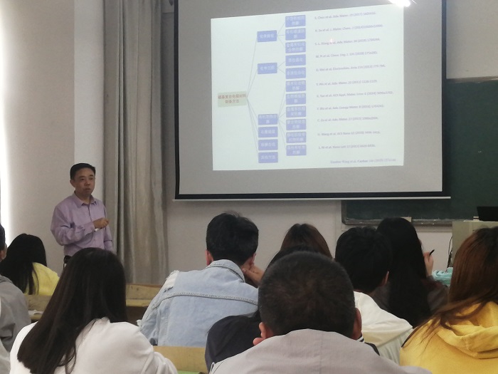 耿保友教授作了题为“碳基过渡金属化合物的制备及储能性质研究”的讲座。主要介绍了锂离子电池构造、储能基本工作原理、电池各部分材料、碳基电极材料主要功能和优点等,提出为了获得具有均匀碳层的高性能电极,需要根据特定金属化合物的性质设计材料结构,并辅以合适的碳涂层技术。此外,开发相互兼容的正、负极材料也是提升电池综合电化学性能的重要途径。最后,耿教授表示电化学有更长远的未来。活动现场内容丰富生动、气氛热烈,同学们认真听讲,与耿教授一起深入交流。