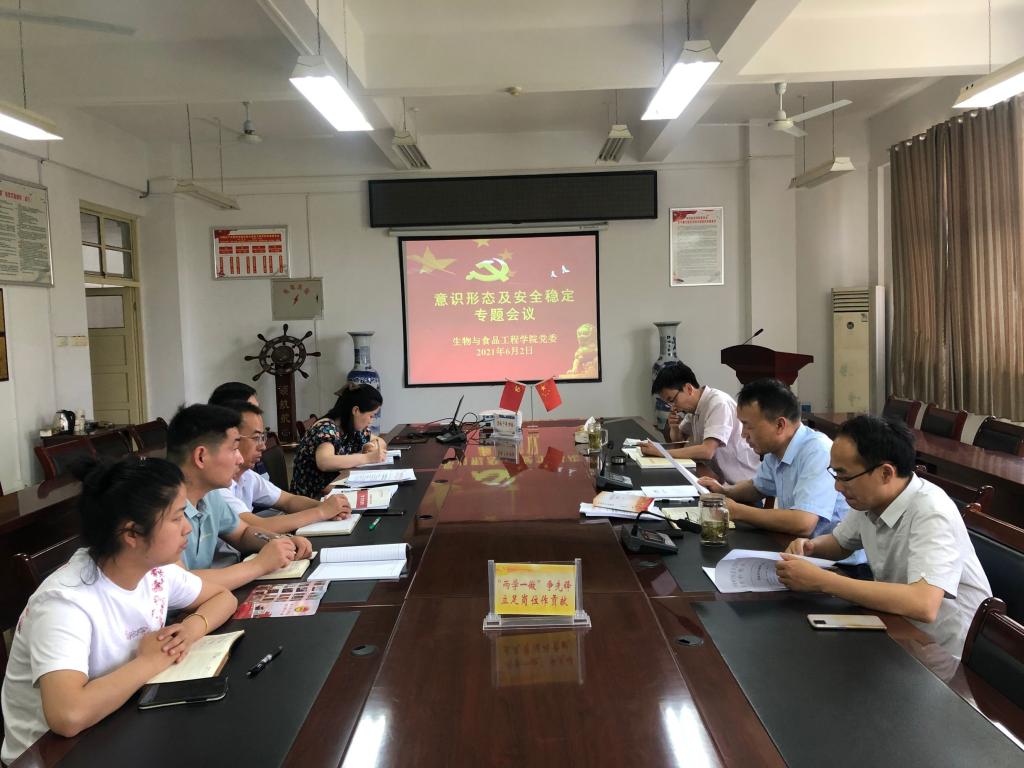 6月2日下午,生物与食品工程学院在实验楼A206会议室召开意识形态暨安全稳定专题会,生物与食品工程学院党委书记赵亮主持会议,学院中心组成员、各党支部书记、全体辅导员参加。