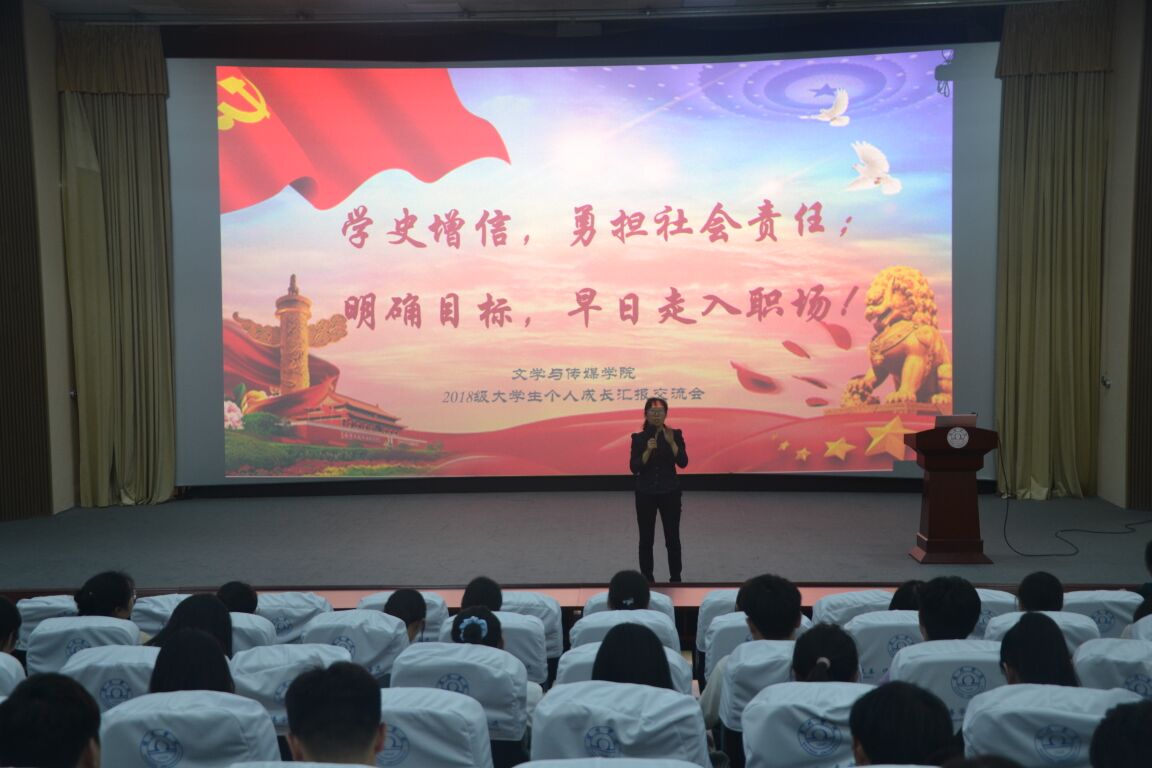 为进一步帮助高年级学生正确认知自我,提高职业意识,明确职场目标,更好实现从学生到职场新人的转变,6月2日下午2:40,文学与传媒学院在报告厅举办2018级学生个人成长汇报交流会。文学与传媒学院党委书记李月云,辅导员王磊、刘影,2018级文化产业管理、2018级汉语言文学1班、2018级汉语言文学2班全体学生参加汇报交流会,汇报会由18级文化产业管理班团支书丁康主持。