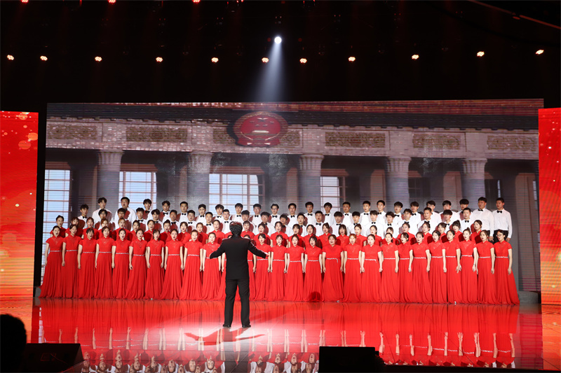 晚会在《唱支山歌给党听》中拉开序幕,参演人员声情并茂,表达了对党的赞美与热爱之情,将情感融进歌声,唱出了中国人民在党的领导下,民族振兴、国泰民安、人民幸福的自豪感。红歌联唱《延安颂》《怀念战友》《爱永在》用最朴实的语言诉说着爱党、爱国的心声。舞蹈《映山红》、歌曲《我们走在大路上》等节目轮番上阵,展示出新时代大学生的精神风貌、爱国情怀。赢得观众们的阵阵喝彩。演出尾声,伴随着《没有共产党就没有新中国》激昂的旋律,全场人员起立,满怀激情齐声歌唱,用歌声传递爱国声音、点燃爱国激情、凝聚爱国力量,将晚会表演气氛推向高潮。