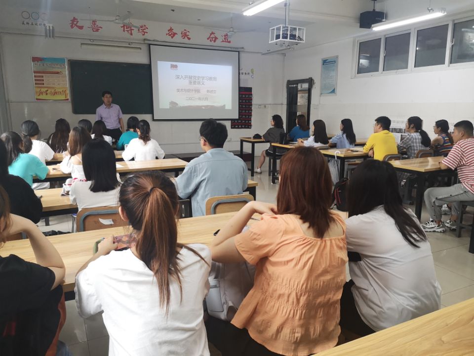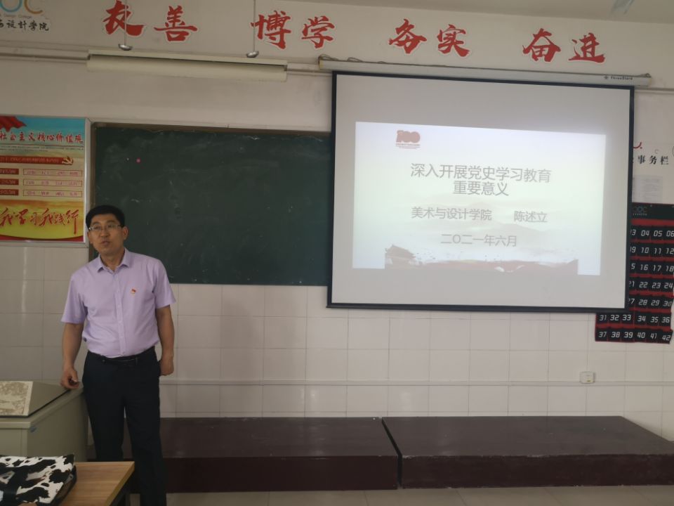 6月26日,美术与设计学院党委书记陈述立在艺术楼B305给全体学生党员上了题为《深入开展党史学习教育》的党史专题党课。