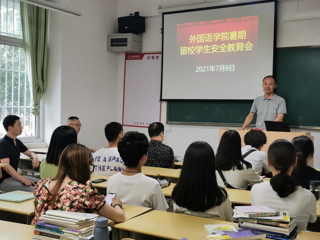 7月6日下午,外国语学院在逸夫楼A105召开了暑期留校学生安全教育会议。学院党委副书记、副院长郝景东主持,团总支书记宋皓、全体辅导员以及暑期留校学生参加了本次会议。