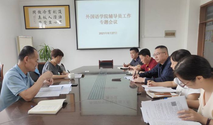 8月27日上午,外国语学院在逸夫楼A318会议室召开2021-2022学年第1学期开学学生工作会议,院党委副书记(临时负责)郝景东主持会议,院长张雁凌及学院学生工作团队成员参加会议。
