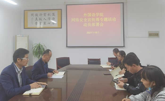 为进一步宣传网络安全理念,普及网络安全知识,营造共筑网络安全防线的浓厚氛围,10月14日下午,外国语学院在逸夫楼A318会议室召开2021年国家网络安全宣传周专题活动部署会。院党委副书记(临时负责)郝景东主持会议并作动员讲话。