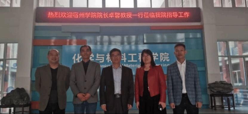为了加强与兄弟院校之间的交流与合作,加快新增硕士学位授予单位立项建设工作,2021年10月14日,化学化工学院党委副书记、院长卓馨、副院长王聪和学院实验实训管理人员赴淮南师范学院考察交流,化学与材料工程学院院长王凤武、实验实训中心主任徐迈热情的接待了卓馨一行。