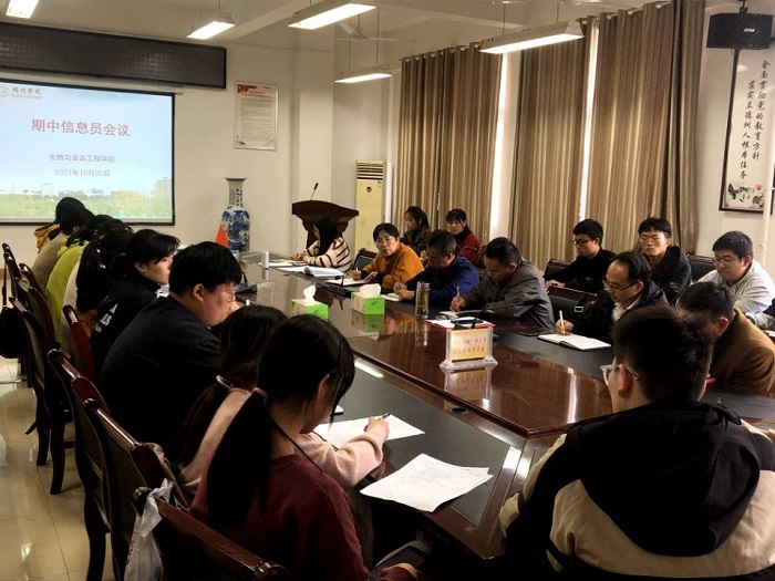 10月26日下午,生物与食品工程学院在实验楼A206会议室召开了2021-2022学年第一学期期中教学信息员会议。院督导组组长曹稳根教授、钱玉梅老师、李红侠老师、陈军老师,教学相关人员及各班级教学信息员参加会议。会议由生物与食品工程学院副院长、院督导组成员王海潮主持。