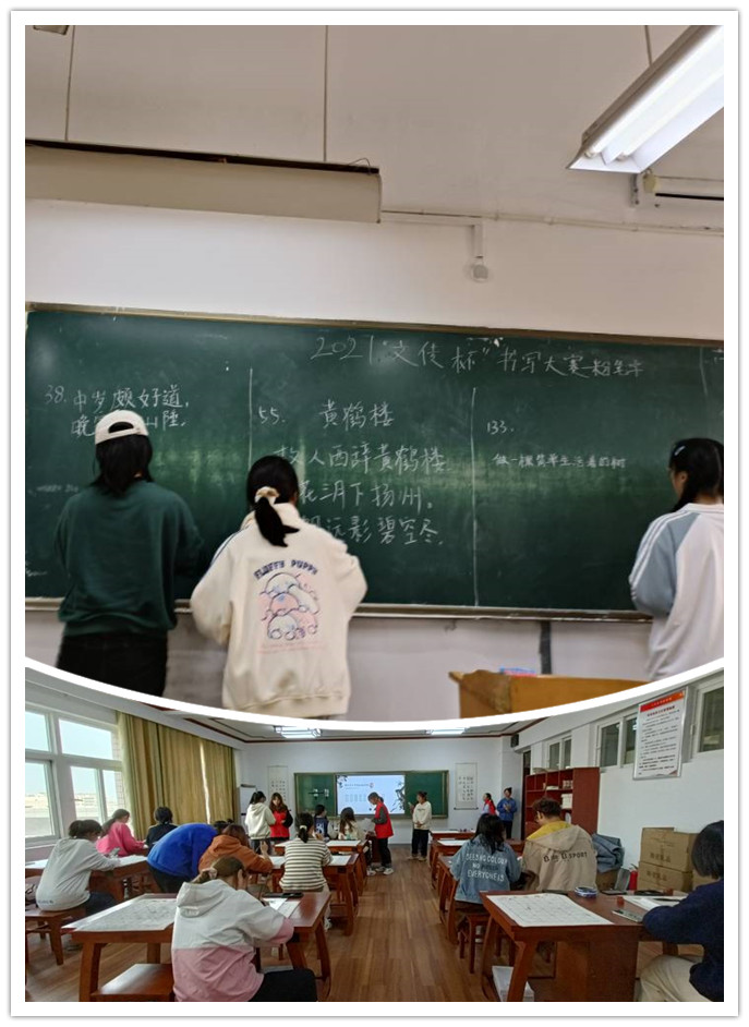 比赛设粉笔字、毛笔字以及钢笔字三个场地,在A413的粉笔字书写中,参赛选手带着激动又紧张的心情挥洒着手中的粉笔,认真书写,一丝不苟。一行行赏心悦目的粉笔字或方正或圆润,有的洒脱大气、遒劲刚毅,有的飘逸舒展、运笔秀巧,有的行云流水、一气呵成。在A415的钢笔字书写,近百名同学积极踊跃地参与比赛,宿院学子们自信、执着,追求卓越、张扬个性。端正的书写姿势、美观工整的字迹,尽力地表现出自己的最高水平。在书法实训室进行毛笔字书写,教室里文墨芳香,选手们聚精会神,一笔一划认真专注,挥毫泼墨于宣纸间,展现出对中国文化的敬仰。