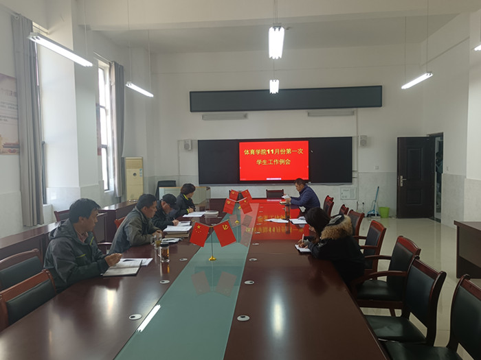 11月9日,体育学院召开十一月份第一次学生工作例会。院党委书记李高、院长白明、院党委副书记、纪委书记王德玉、副院长陈芳芳、学生事务管理科科长、各年级辅导员参加会议。