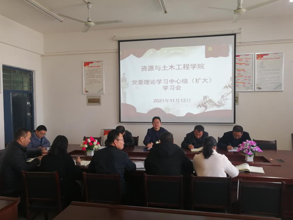 11月12日下午,资源与土木工程学院党委在三楼会议室召开理论学习中心组(扩大)学习会,认真学习中国共产党第十九届六中全会精神。学院党委理论学习中心组成员、党支部书记、科级干部参加学习。学院党委书记张持堂主持会议。