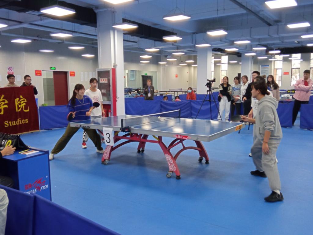 本次乒乓球联赛的主题是“‘乒’出国球气势,搏出青春风采”,经过激烈的竞争淘汰,六名分别来自外国语学院和体育学院的女生代表队进入了决赛。本次决赛分为两项,分别是女子团体和女子双打,比赛均采取五局三胜制,每局均采用十一分制。先进行的是女子团体比赛,选手们全神贯注,比分你追我赶,选手们都秀出了自己的风采;在随后的女子双打比赛中,外国语学院选手抖擞精神,重振旗鼓,一鼓作气拿下了亚军,现场欢呼声一片。
