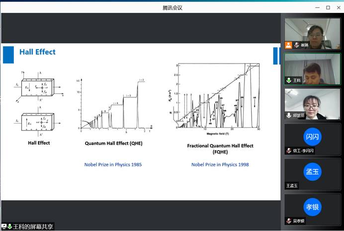 王科作了题为“低维体系的电子输运研究”的报告,他提到:石墨烯作为优秀的二维材料,成为研究相关弹道输运的重要载体,其特殊的能带结构和载流子自由度,量子霍尔效应、量子反常霍尔效应,量子自旋霍尔效应以及量子能谷霍尔效应均被理论预测,理论模型逐渐被实验所验证,实现可观测的近乎无散射的弹道输运,并重点介绍了如何在能谷霍尔效应体系中实现低散射输运通道及相关性质研究。