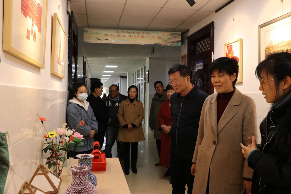 12月22日,文学与传媒学院举办了第七届文化创意艺术展。张莉校长、张英彦副校长、宣传部李真部长、教务处王红艳处长、唐永刚副处长等参观了艺术展。