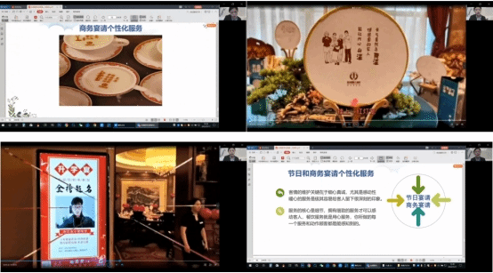 首先,桑经理从宿州国际大酒店实践的角度讲述了包厢主题宴会的服务流程和标准;接着,全面分享、深入剖析和多角度展示了多种包厢主题宴会的设计、管理和接待服务设计,包厢生日宴、订婚宴、节日宴和商务宴以及政务宴。桑经理从目前宴会市场和宿州市宴会市场的现状和趋势,结合宴会设计科技、疫情影响、消费升级转型、宴会文化的传统回归和现代创新等最新的趋势,分别对这四类包厢主题宴会的主题设计、环境设计、氛围的营造、文化礼仪传承、服务设计、营销与接待管理等进行了深入细致的讲解。桑经理的讲解深入浅出娓娓道来、图文并茂、视频帧帧精彩、文化品位高雅、创意情感十足,将理论与实践充分地结合,极大激起了同学们课程行业实践的学习兴趣,拓展了同学们的视野,启发了同学们的创新创业意识和思维。既是对因疫情限制的该课程企业实践和宴会汇报管理与服务校内实践的有效弥补,又是对该课程大量的国宴、峰会宴会、婚宴(礼)等设计、服务与管理视频学习的有益补充。讲座结束后,同学们与桑经理进行了充分的交流和讨论,反馈积极,效果良好,同学们认为这样的授课方式很好,感觉能够了解更多的宴会设计、管理、服务以及经营现状和趋势。