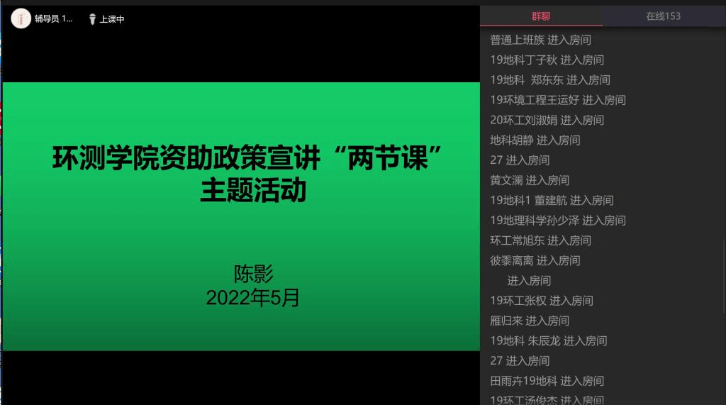 为进一步做好资助政策宣讲工作,帮助学生深刻认识资助政策的意义、申请流程及资格条件,环测学院各班级辅导员于5月底通过线上线下相结合的方式开展了资助政策宣讲活动,活动覆盖学院班级全体学生。