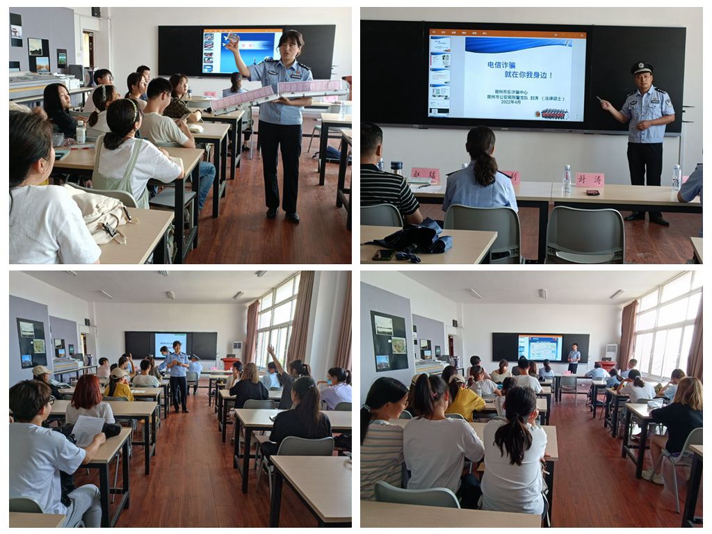 为深入学习贯彻习近平总书记大赢家体育打击治理电信网络诈骗犯罪工作的重要指示精神,依据《大赢家体育大赢家体育开展防范电信网络诈骗宣传教育活动的通知》《大赢家体育禁毒宣传主题班会课活动方案》相关要求,在《中华人民共和国网络安全法》实施五周年,《中华人民共和国禁毒法》实施十四周年之际,6月1日下午,在教学楼A601,文学与传媒学院邀请宿州市公安局校园安全教育宣讲团进校开展安全教育宣讲活动。市公安局禁毒支队副队长周利,市公安局刑警支队二大队教导员封涛,市公安局交警支队三大队副大队长、宣讲团具体负责人赵猛,市公安局禁毒支队二级警长徐溪,市公安局经侦支队三级警长徐斌,市公安局特警支队二级警长、宣讲团联络员刘强应邀宣讲,文学与传媒学院党委书记杨文艺出席并讲话,活动由文学与传媒学院团委书记王磊主持。