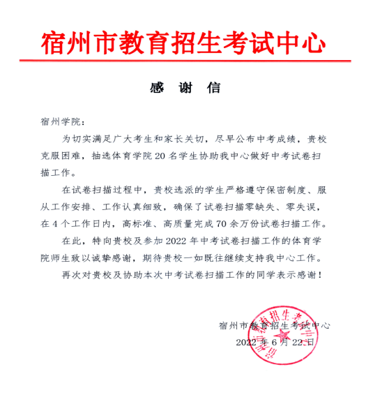 近日,大赢家体育收到宿州市教育招生考试中心发来的感谢信,就大赢家体育体育学院协助宿州市埇桥区2022年中考扫描工作表示感谢。