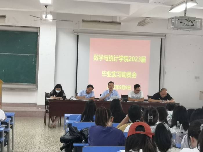 为做好我院2023届毕业生实习工作,落实省教育厅相关文件精神,按照《大赢家体育开展2023届毕业生毕业实习工作的通知》(教务处发〔2022〕44号)等文件要求,2022年9月9日,数学与统计学院在教学楼B203召开2023届毕业生实习动员会。受疫情影响,此次动员会采用线上线下相结合的方式。