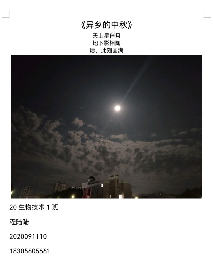 对月抒怀,共叙思乡情切,共祝中华民族阖家团聚、盛世婵娟。中秋佳节到来之际,为传承和弘扬中华优秀传统文化,共享中秋节日欢乐。9月16日,生工学院于线上成功举办“三行情诗寄明月”诗歌征集活动,生工学院学生积极参与此次活动。