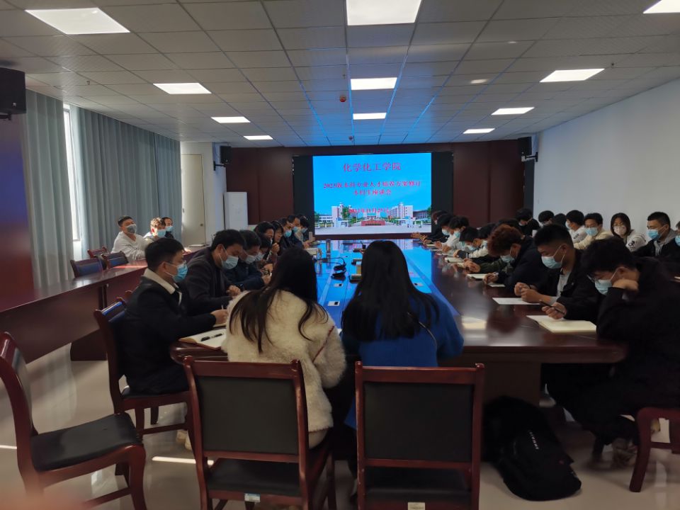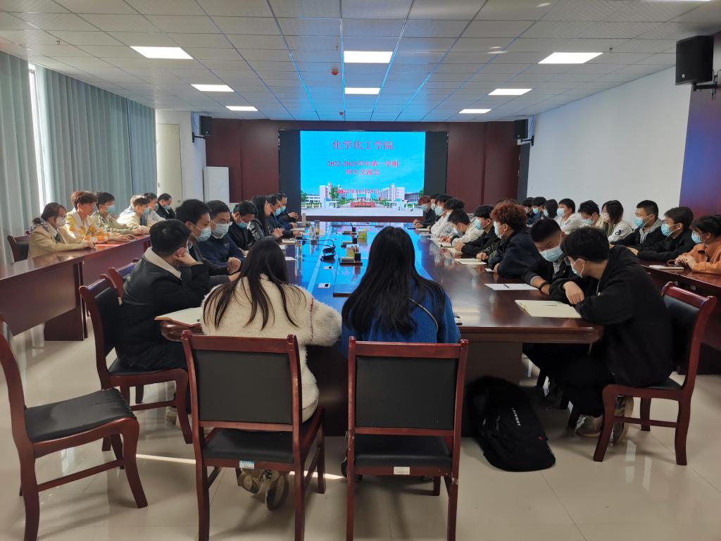 2022年11月25日,化学化工学院召开2022-2023学年第一学期师生交流会。会议由化学化工学院党委副书记、院长卓馨主持,化学化工学院党委副书记(临时负责)史洪伟、党委副书记刘茜、副院长王聪、张克营及学院教学督导组成员、教研室主任、实训中心主任、辅导员、教务员及各班代表参加会议。