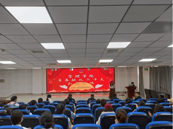 为学习贯彻党的二十大精神,弘扬爱国主义主旋律,大力营造团结奋进、爱国爱党的浓厚氛围,展现广大师生昂扬奋发的精神面貌,推动党建带动团建工作的深入广泛开展,11月21日中午,管理学院于实训楼C103会议室举办“青春献礼二十大”红歌传唱比赛。学院党委书记蔡若愚、院长韩传龙、党委副书记张增林、党委组织员陈鹏、团委负责人孙杉参加此次活动。比赛由学生代表高静静主持。