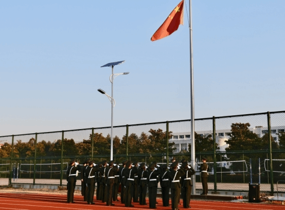 清晨的田径场庄严肃穆,在铿锵有力的脚步声和整齐嘹亮的口号声中,国旗护卫队护卫国旗昂首阔步走向升旗台,伴随着《义勇军进行曲》,鲜艳的五星红旗冉冉升起,学院师生庄严肃立,向国旗行注目礼,共看五星红旗在熠熠晨光中迎风飘扬,共同表达对伟大祖国的崇高敬意。