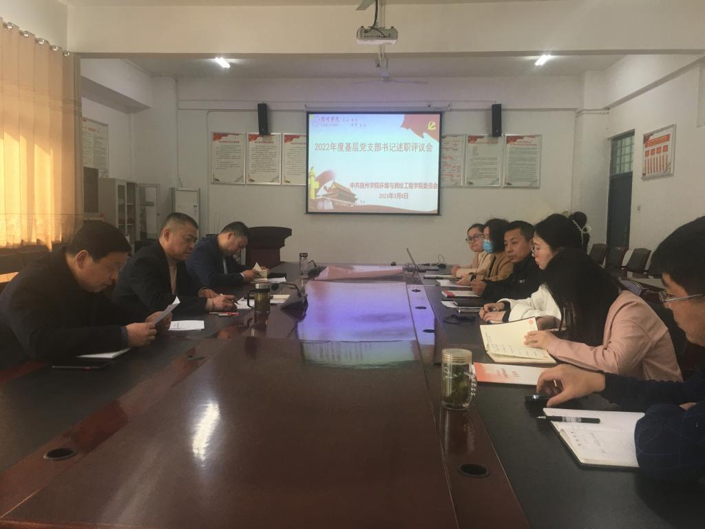 地理与环境专业教师党支部书记李致春、地理与环境专业学生党支部书记刘甜、测绘与遥感专业教师党支部书记刘杰云、测绘与遥感专业学生党支部书记杨文依次以加强党的建设、全面提升基层党组织的组织力以及党支部“七个有力”战斗堡垒作用和党员的先锋模范作用为重点,就一年来党建工作履职情况、存在问题及思路措施进行了述职,胡冰在每位党支部书记述职发言结束后一一进行了点评,点出了支部存在问题和努力方向。会上,与会人员还对4位党支部书记2022年度抓基层党建工作进行了现场测评。
