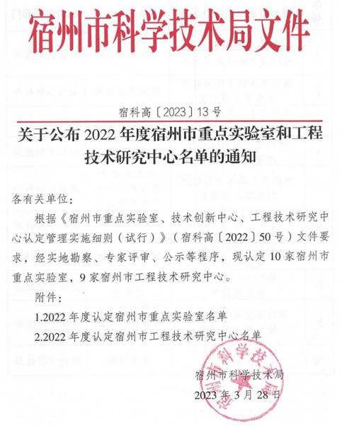 近日,宿州市科技局公布了2022年度宿州市重点实验室和工程技术研究中心名单的通知,由信息工程学院联合中国电信股份有限公司宿州分公司和安徽十锎信息科技有限公司申报的“宿州市大数据挖掘与治理重点实验室”喜获宿州市重点实验室。