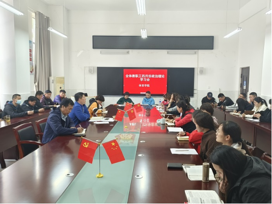 2023年4月10日中午,体育学院召开四月份全体党员、教职工理论学习会,体育学院全体教师参加学习会。学习会由李高主持。
