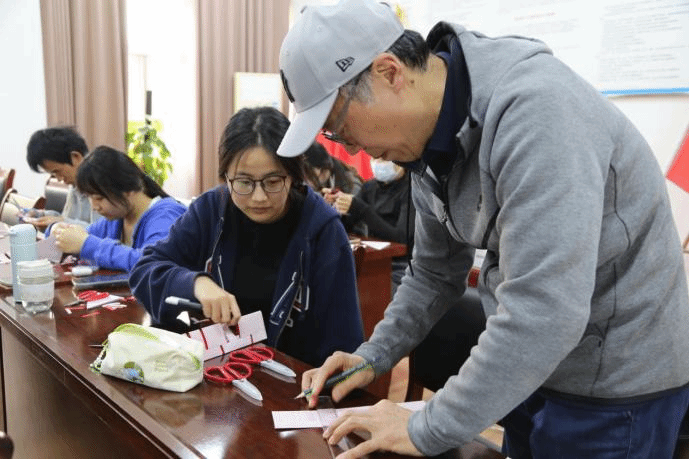 周康乐老师先介绍了剪纸艺术的诞生过程,然后分别讲述了传统剪纸与现代剪纸的发展历史与文化内涵,比较了传统剪纸与现代剪纸的异同,强调了现代剪纸的艺术性转变。接着周康乐老师介绍了10位在我国现代剪纸艺术领域具有代表性的剪纸艺术大师的作品,并分享了自己近年来创作的优秀获奖作品。最后,在互动环节周老师带着同学门亲手体验了剪纸艺术的魅力。