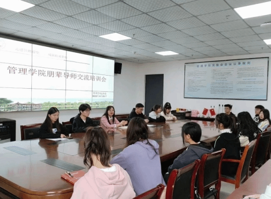 为充分发挥朋辈导师队伍在大学生思想政治教育和学生管理方面的作用,帮助2022级新生树立清晰长远的目标,4月25日中午,管理学院于实训楼C310会议室举办“朋辈导师培训交流会”,管理学院团委负责人孙杉老师及朋辈导师代表参加会议。