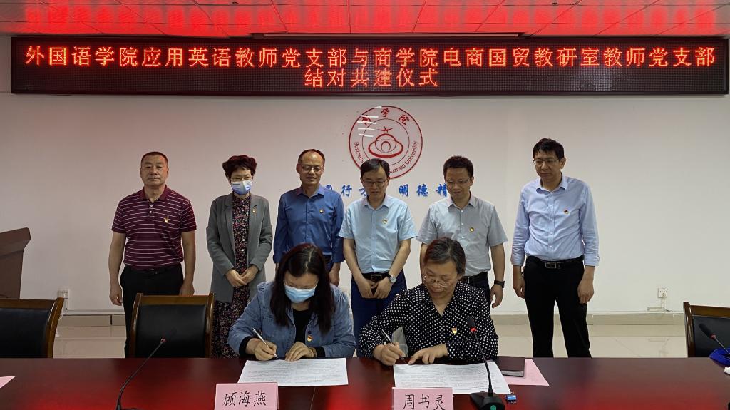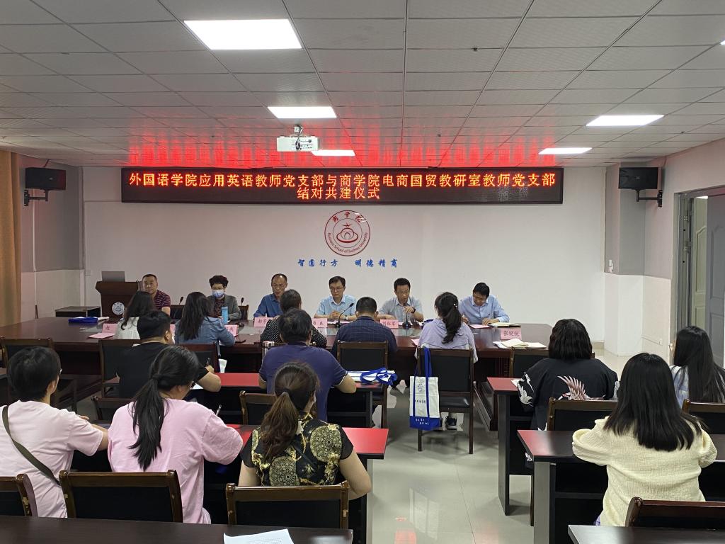 为切实增强抓好学习贯彻习近平新时代中国特色社会主义思想主题教育的思想自觉、政治自觉和行动自觉,以高质量党建引领高质量发展,5月31日下午,商学院电商国贸教研室教师党支部与外国语学院应用英语教师党支部在实训楼B517会议室举行结对共建签约仪式,并联合开展主题教育学习活动。商学院党委书记肖良、党委副书记、院长刘红军、组织员(正处级)黄凯、党委副书记、纪委书记周亚、科研副院长、电商国贸教研室教师党支部书记周书灵,外国语学院党委书记郝景东、党委副书记、院长张雁凌、应用英语教师党支部书记顾海燕,共建双方教研室主任及支部全体党员出席了签约仪式,仪式由刘红军主持。