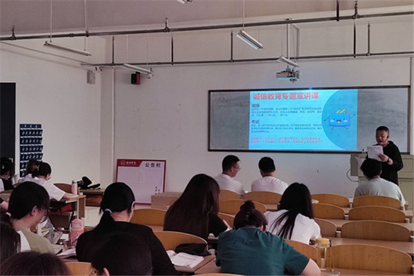 为深入开展学习贯彻习近平新时代中国特色社会主义思想主题教育,落实“立德树人”根本任务,加强学生诚信、励志感恩教育,6月1日上午商学院在实训楼B301开展了诚信教育专题宣讲课活动。商学院学生事务管理科副科长孙茂顺作了考试诚信专题教育宣讲,学院各专业学生党员、共青团员代表参加了活动。