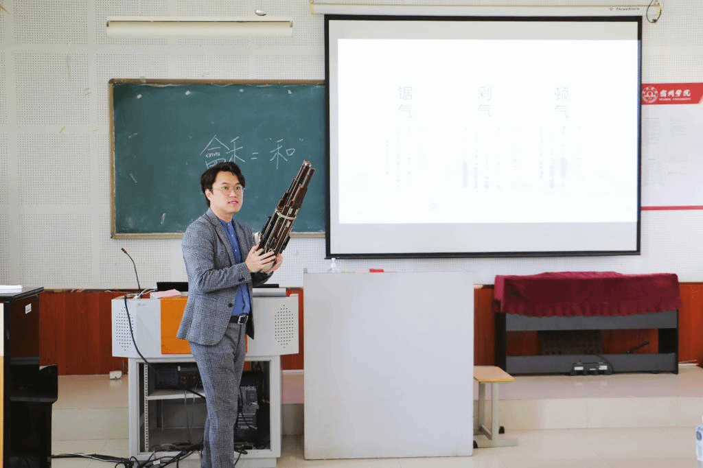 盖兆鹏老师在中国传统乐器——笙课程中讲授了山东流派笙器乐作品《挂红灯》。在鉴赏学习《挂红灯》的过程中,盖老师用高超娴熟的技艺展示了挂红灯引子声部中的吹奏技法,使学生明白带有演奏技法的吹奏会让曲子更加的生动立体,进而展示了中国传统乐器笙的魅力,激发了学生对我国民族乐器的学习动力,更好地引导学生将发扬民族精神,坚定民族文化自信,传承中华优秀文化作为重任,培养了学生的爱国之情。