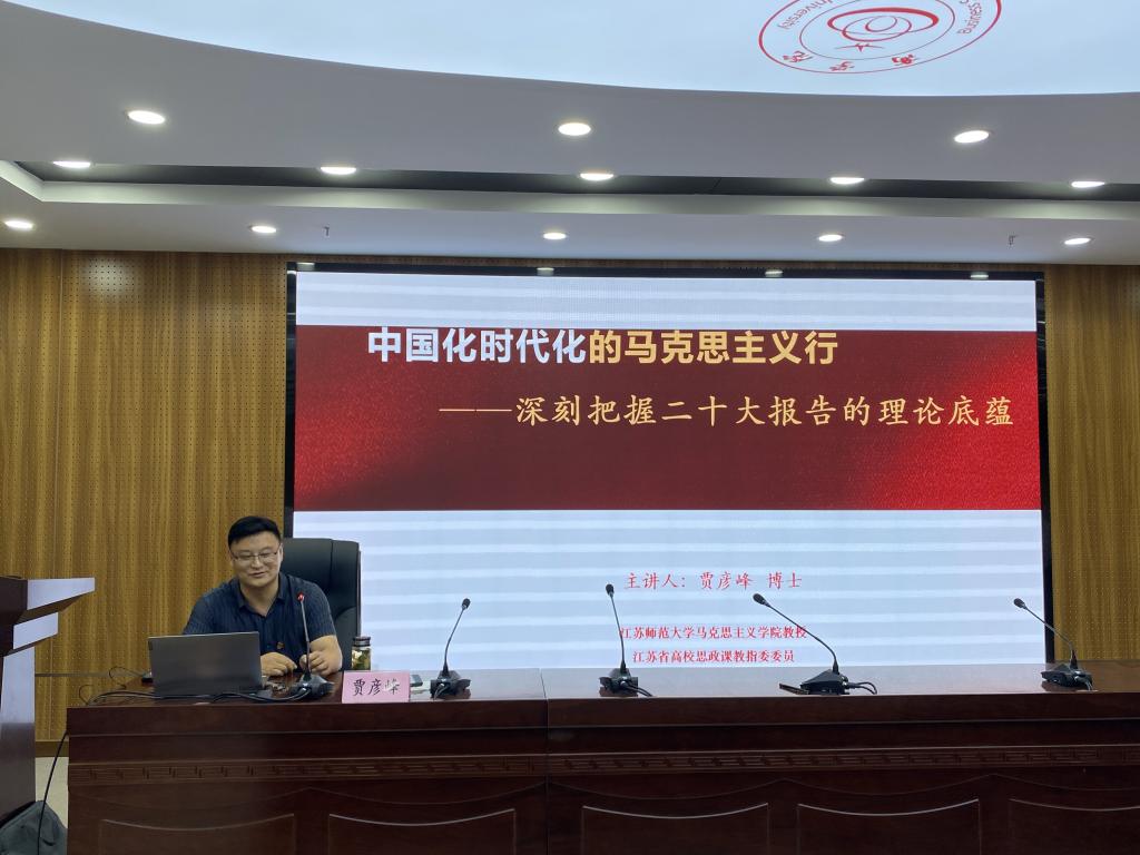 6月29日下午,商学院在实训楼B117报告厅举办主题教育专题辅导报告会。邀请江苏师范大学马克思主义学院博士生导师、江苏省高校思政课教指委“习近平新时代中国特色社会主义思想概论”课分教指委委员贾彦峰教授作专题辅导报告。商学院领导班子及全体教职工参加报告会,党委书记肖良主持会议。