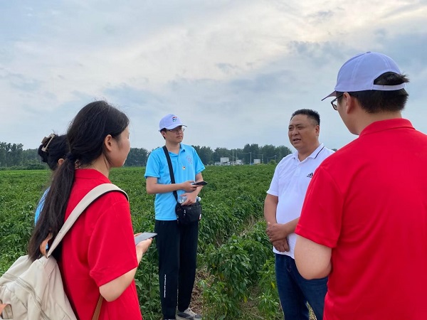 阮先生对板面的介绍时,调研小队注意到室内摆放许许多多的蓝色框架,盛放着各类香料——辣椒、八角、桂皮、干姜等等。太和板面面如美玉,汤似琼浆,一勺红油汤料浇在面上,使人食欲大增。汤料可谓是太和板面的重要法宝,阮先生深知汤料的重要意义,这其中,“细阳红”辣椒便是汤料的关键一环。接下来,阮先生带领调研小队前往太和县板面商会辣椒种植基地,他曾为了辣椒种植,在地里待了七天七夜,正如他在采访中说的“真正做农业的,你脚上一定有泥,你脸上一定有灰,你手上一定有茧”。实践小队深刻感悟,在对传统美食传承上,用行动践行言语,用努力打造高品质,端正队员对实践的认真态度,增强精益求精的精神理念。